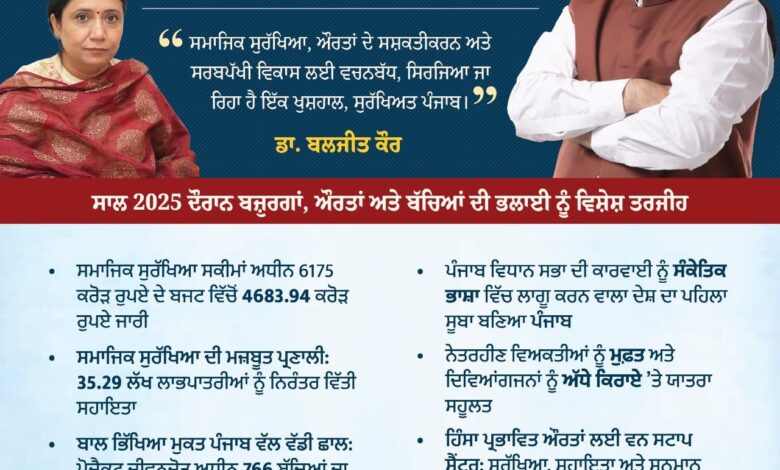 मुख्यमंत्री स भगवंत सिंह मान के नेतृत्व में पंजाब सरकार द्वारा समाज के हर वर्ग के कल्याण के लिए निरंतर जन-हितैषी नीतियां लागू की जा रही हैं। बुज़ुर्गों, महिलाओं, बच्चों और दिव्यांगजनों की सामाजिक एवं आर्थिक सुरक्षा सुनिश्चित करने के लिए वर्ष 2025 (वित्तीय वर्ष 2025-26) के दौरान कई ऐतिहासिक पहलें की गई हैं। यह जानकारी सामाजिक सुरक्षा, महिला एवं बाल विकास मंत्री डॉ. बलजीत कौर ने दी।